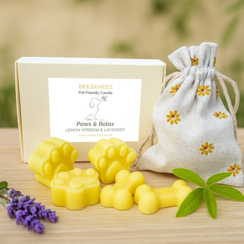 Bring calm into your home with Paws & Relax, our Lemon Verbena & Lavender Pet Friendly Wax Melt. Infuse your space with the uplifting freshness of lemon verbena and the gentle calm of lavender — a blend perfect for relaxation, meditation, or simply enjoying a peaceful moment at home. Our wax melts come as a pack of 5 — 3 paw shaped and 2 bone shaped.